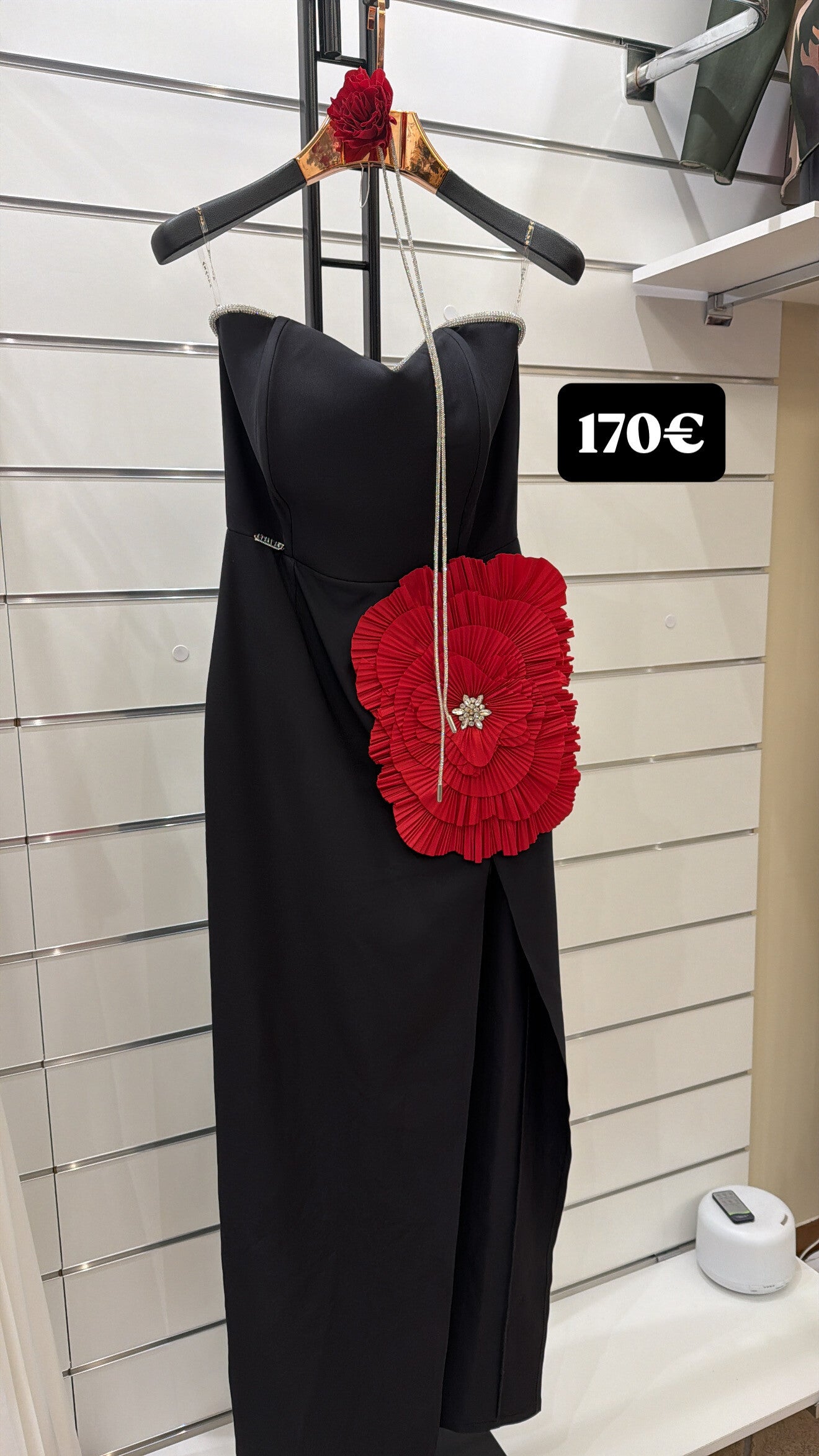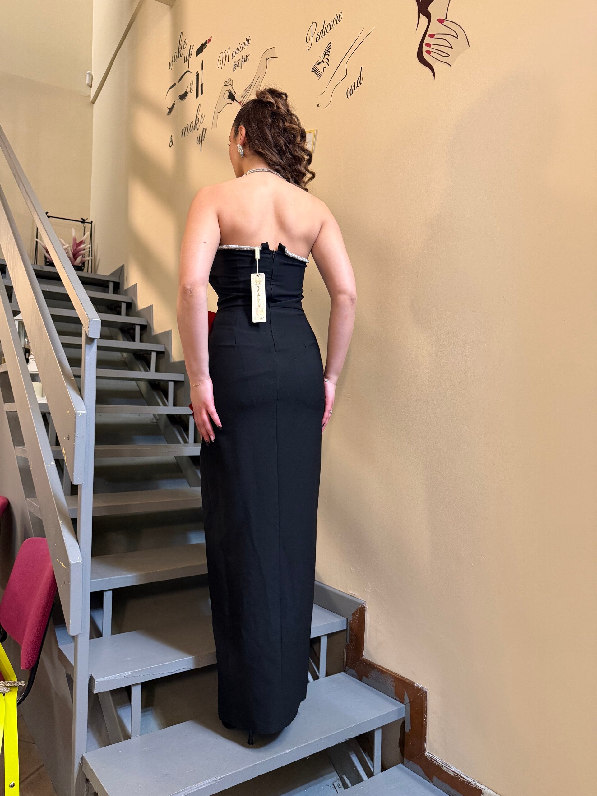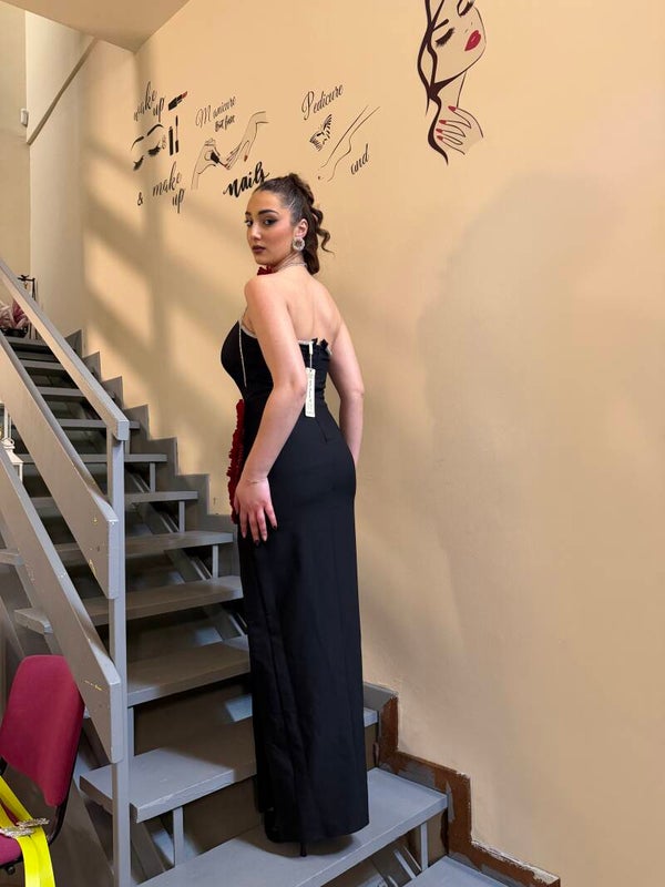 Abito lungo nero dal design raffinato e sensuale, impreziosito da un elegante fiore rosso plissettato applicato sul fianco, simbolo di femminilità e carattere. Il corpino strutturato valorizza la silhouette, mentre le spalline sottili e il dettaglio luminoso donano un tocco di luce e sofisticatezza.
